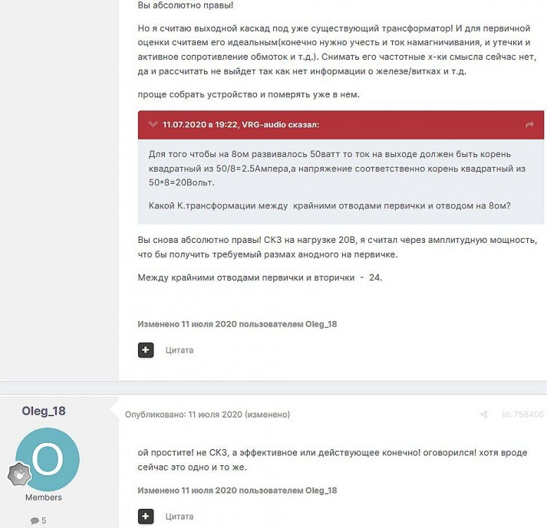 11. Sacha3 Опубликовано: 7 апреля 2019 Теперь понял. Спасибо. 07.04.2019 в 13:57, CHEL_EV сказал: И всё таки, какие то у меня сомнения. У Цыкина где то 20 формул, а тут определил Ктр, намотал вторичку, можно сказать на глаз и вычислил первичную. Всё. ________________________________________________________________________________________________________________________________________________________________________________________ CHEL_EV Опубликовано: 7 апреля 2019 Если есть сомнения, то надо намотать один трансформатор, и через неделю всё будет хорошо. Я Вам дал пример для прикидки, что и сколько мотать. Но можно озадачится и формулами, так правильнее, соответственно дольше и сложнее. Я постарался объяснить на пальцах, из своего скромного опыта. ______________________________________________________________________________________________________________________________________________________________________________________ VRG-audio Опубликовано: 7 апреля 2019 У Цыкина настоящий расчет , следуя которому вы должны ориентироваться на мощность, индукцию, нижнию частоту, индуктивность , и индуктивность рассеяния. Тут же вам предлагают обычный конструктивный расчет , чтобы проволока залезла. Вот и все. Такие здоровые сердечники , с таким окном для 12 ватного усилителя совсем не в тему. ____________________________________________________________________________________________________________________________________________________________________ Sacha3 Опубликовано: 7 апреля 2019 Я думал от 6550 можно 25 ватт получить. ______________________________________________________________________________________________________________________________________________________________________ VRG-audio Опубликовано: 8 апреля 2019 (изменено) Если на 6550 то да , можно и 25 и даже больше . По даташиту в УЛ 40% при 5.6К получается до 34Ватт. Тогда для макс.индукции в сердечнике 1Тл на 25Гц (для ленточных сердечников это нормально) , сечением стали 12.5см.кв. вам понадобится 3000витков первички (по 1500 на плече). В любом случае окно 40мм на 100мм это очень много. П.С УЛ отвод лучше брать 50% , потому что 40% обычно конструктивно тяжелее выполнить. _____________________________________________________________________________________________________________________________________________________________ Sacha3 Опубликовано: 8 апреля 2019 6550 будут работать в триоде. _____________________________________________________________________________________________________________________________________________________________________________________ VRG-audio Опубликовано: 8 апреля 2019 Тогда еще проще. 4К нагрузка . 2800витков (по 1400 на плече). Макс.мощность будет вообще на 20Гц!. В любом случае окно 40*100 не в тему ? ________________________________________________________________________________________________________________________________________________________________________ SSnessarev Опубликовано: 8 апреля 2019 Отличное окно. Провод потолще - активное первички ниже. Изоляция межслойная и межсекционная потолще - меньше емкости всякие. При желании можно и катодные обмотки сделать . ____________________________________________________________________________________________________________________________________________________________________ VRG-audio Опубликовано: 8 апреля 2019 Ну вот и напишите новичку конструктичный расчет на это окно и на 2800витков первички. Дайте ему данные на диаметры необходимых проводов , на акт.сопротивления обмоток, индуктивности рассеяния на высоте 4см.и.п.р.... Надеюсь он не офигеет?. ________________________________________________________________________________________________________________________________________________________________________ SSnessarev Опубликовано: 8 апреля 2019 Если чисто конструктивный расчет. При нужном Raa = 14к. Как писали выше. Или очень близко ПЛ 20х64 Габарит намотки 17х96 мм. Первичка , провод 0.6 по меди. 12 слоев (6+6) на каждой катушке. Считаю такое секционирование для ПЛ достаточным. в слое около 144 витка, на одной катушке получается 1728 витков, общее количество витков 3456. Межслойная изоляция скотч малярный (0.1 м