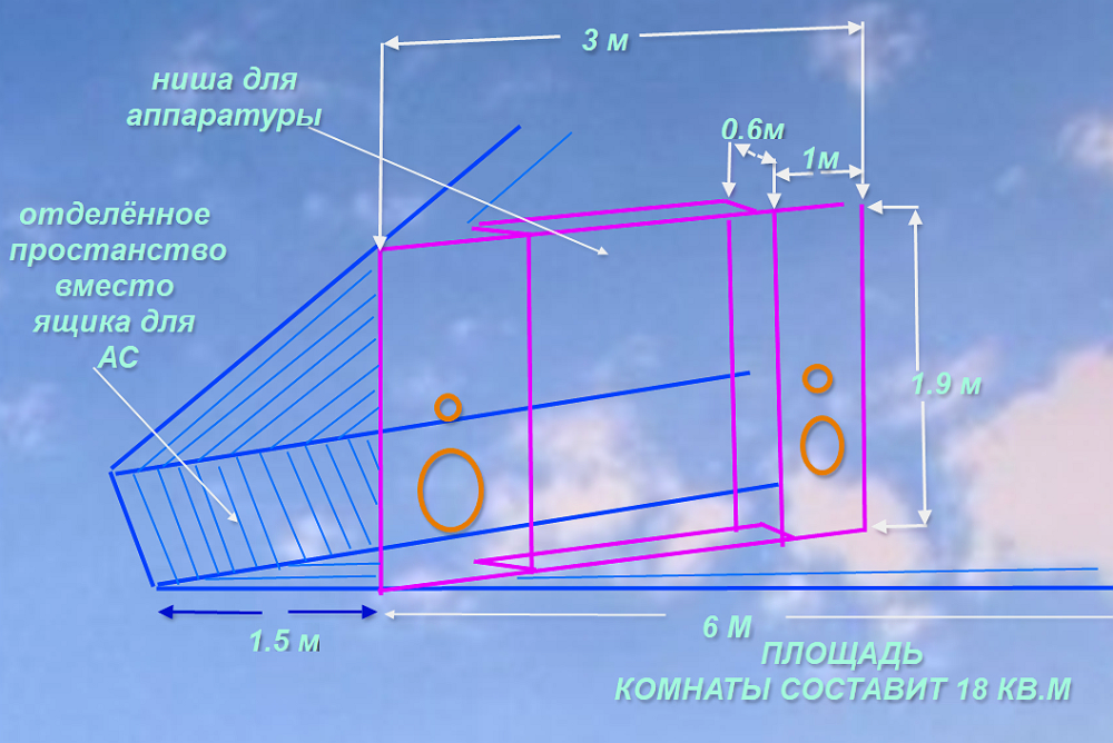 Раз тема создана, дам такую инфу: Помещение полностью герметично и утеплено по принципу северных вагончиков для строителей. Стены и потолок 3-4 слоя оргалит, решётка 5см брус заполнена плотно упсой, герметик и снова оргалит, реш. упса пол лаги 15см и между ними точно так же 3 слоя. Фактически заглушённая камера.... на 22 кв. м, но форма....( ФОТО под спойлером) В своё время слушая 4А32 в ящике малом Онкен приходилось снимать заднюю стенку, иначе звук задемпфирован "до НЕ могу".... В ближайшее время (после НГ) в этой комнате снова буду делать мастерскую, отсюда вопрос к знатокам и к остальным: Если разделить пространство как на рисунке ниже щитом 1.9 х 3 м , по краям врезать динамики, а по середине углубить нишу для полок с аппаратурой, даст ли это определённый эффект для звука, или же лучше для динамиков отдельные щиты? (4А32 подразумеваются, остальная акустика останется в своих ящиках. Есть у кого какие соображения, может подобный опыт имеется? Очень не хотелось бы городить сиё впустую, а после разбирать и на "дрова в печь" утилизировать... фото под спойлером: Всем спасибо! п.с. Размеры по памяти немного плюс-минус, точные будут после рулетки в руках , но суть вопроса, надеюсь, вполне понятна. -