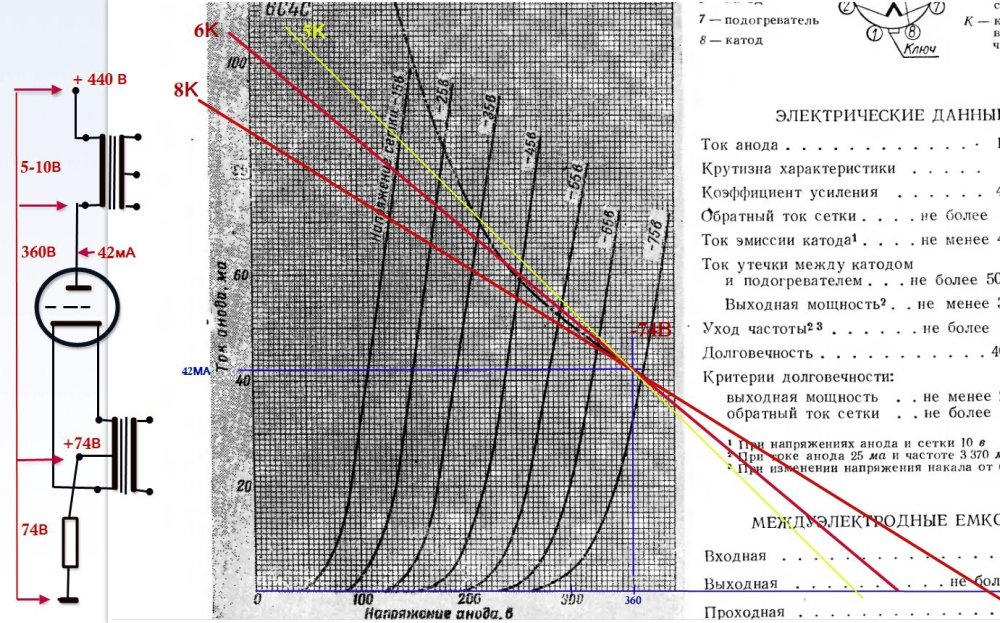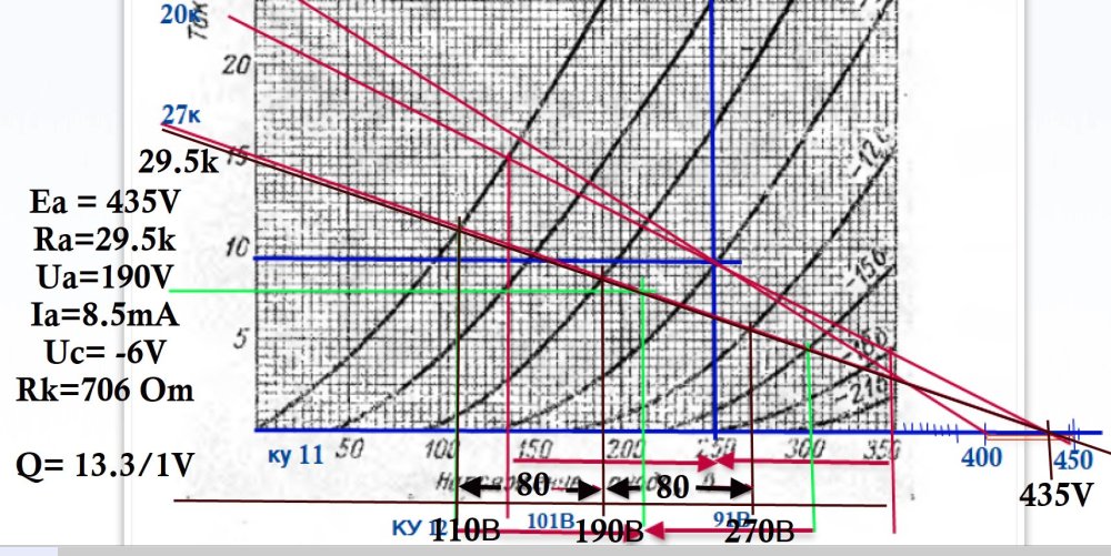 Берём прям по картинке раб.точку -6 в, Ua = 185 в Никита Сергеевич, проверил несколько вариантов с смещением в -6В, в итоге подобрал вариант близкий к предложенному: На БП 435В Резистор нагрузки 29.5 К На сетке -6В Ток покоя 8.5 мА Напряжение на аноде 190В В таком режиме усиление каскада 13.3/1В и ровные полуволны, что даёт нам возможность использовать лампу для раскачки -75В даже с маленьким запасиком 6 х 13 = 78. Впритык, без лишнего запаса , но с ровными характеристиками. Считал, что у 6г1 усиление максимум 12, в итоге всё же получился вариант с Ку=13. Забираю свои слова о неприменимости 6Г1 в нашем варианте, был не прав и поторопился с выводами. Если бы не Ваш напор, так и остался бы при своём ошибочном мнении. ________________________________________________________________________ п.с. Что делать с моими ошибочными комментариями? Подчистить или пусть будут? С одной стороны убери их - нить повествования оборвётся, с другой - торопыги, не дочитавшие до конца тему, сделают неверные выводы.. Никита Сергеевич, тема Ваша, Вам и решать.