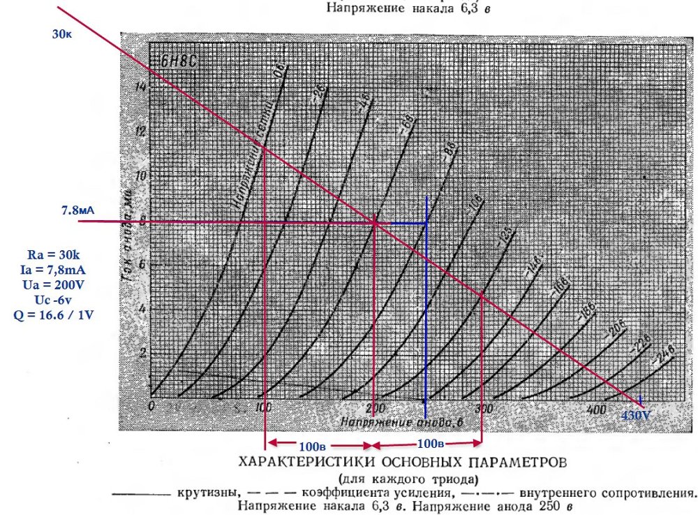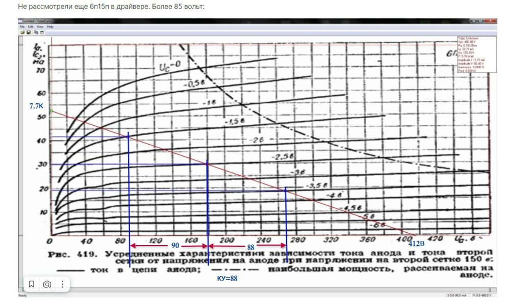 Вы мне под наш режим на графике покажите, зачем схемы другие??? Чертёж читаете? У меня есть ошибки? НЕТ! Не нужно уходить от прямого ответа, прошу. Это ещё почему??? Ку = 16 (у меня 16.6, это нормально) Для раскачки 75В на сетке 6с4с сигнал проходящий через сетку 6н8с будет 75 делим на 16 = 4.68В, ЗНАЧИТ, если мы на сетке 6н8с сделаем -6в, у нас ещё и запас остаётся. Смотрим: Ток отличный, искажений почти нет (по клеточкам, мог и ошибиться немного , вышло 24 клетки и 24.), резистор анодный 30К, ДИНАМИЧЕСКУЮ можем не чертить, при сеточном резисторе утечки в 150-220 к на 6с4с фактически ничего не измениться. Так чем это нам не подходит 6н8с в качестве драйвера для нашего режима? Отлично подходит. Если первой лампой будет так же 6н8с без шунта в катоде, ку будет порядка 11, считаем: 75 делим на 16, далее на 11 - получаем номинальное входное напряжение 426 (430) мв. Всё. задача выполнена.