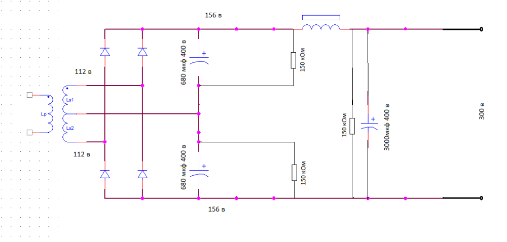 Это для поредваря. вот так получается 56 + 56 = 112 в и 56 + 56 = 112 в 112*1.4 = 156 в и 112*1.4 = 156 в ..посмотри на вложение - я нарисовал предварь ....номиналы резисторов верны ? второй конденсатор на 3000 мкф ибо другого нет - кончились.. Между маленькими конденсатором и большим станет дроссель.
