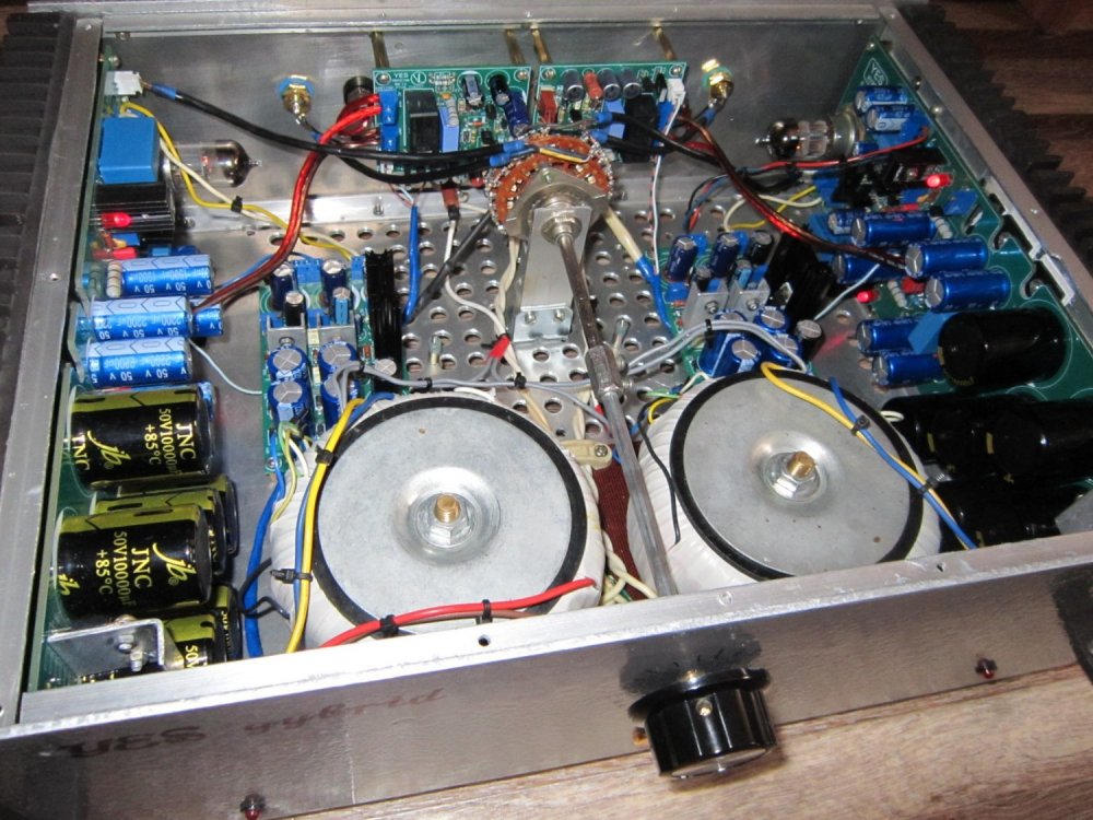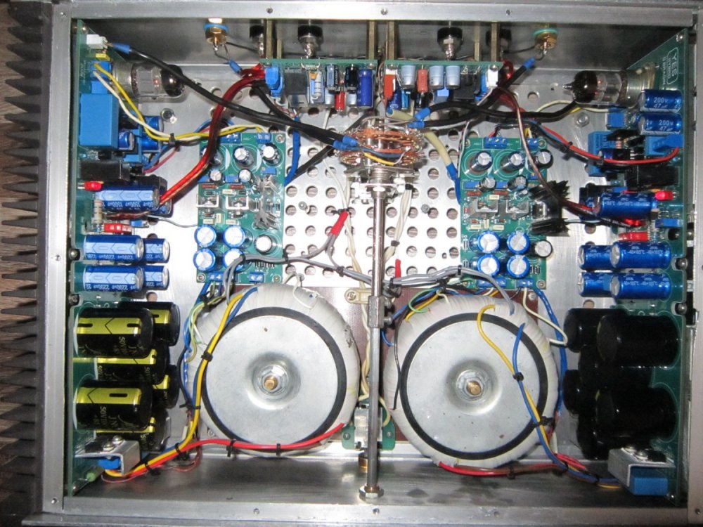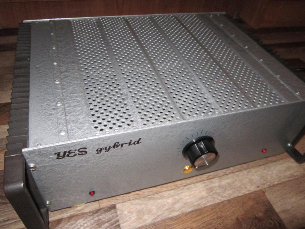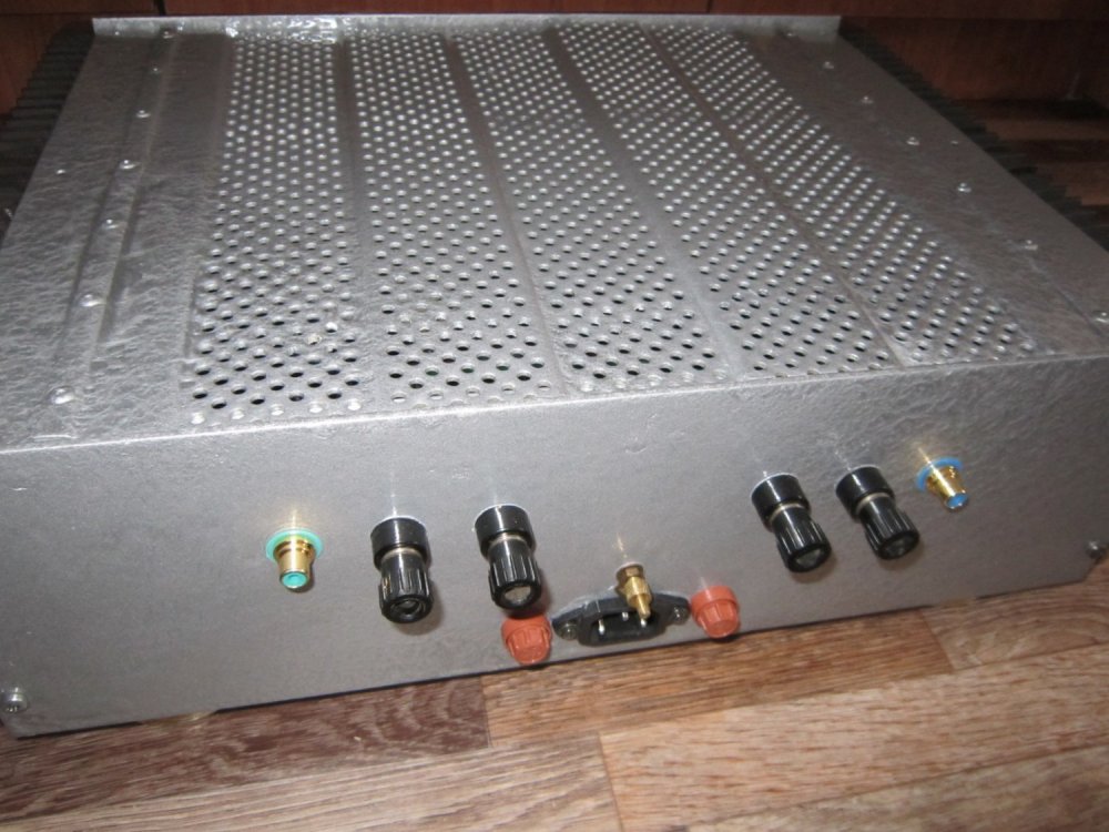 Корпус сделал сам, радиаторы от усилителя "Степь 100у-101". В корпусе двойное МОНО, общий провод двух каналов соединён в одной точке на задней панели усилителя к латунному болту М4, тудаже буде подключатся общий провод от усилителя-корректора. Между трэками в паузах полная тишина, глубина сцены хорошая, разделение каналов тоже хорошее. Звучание я описывать не умею, не эксперт, но оно хорошее. Внутри корпуса нужно нормально уложить провода, это чуть позже будет. Вчера слушал 2 часа, звук не утомляет. Источник звука был виниловый проигрыватель.