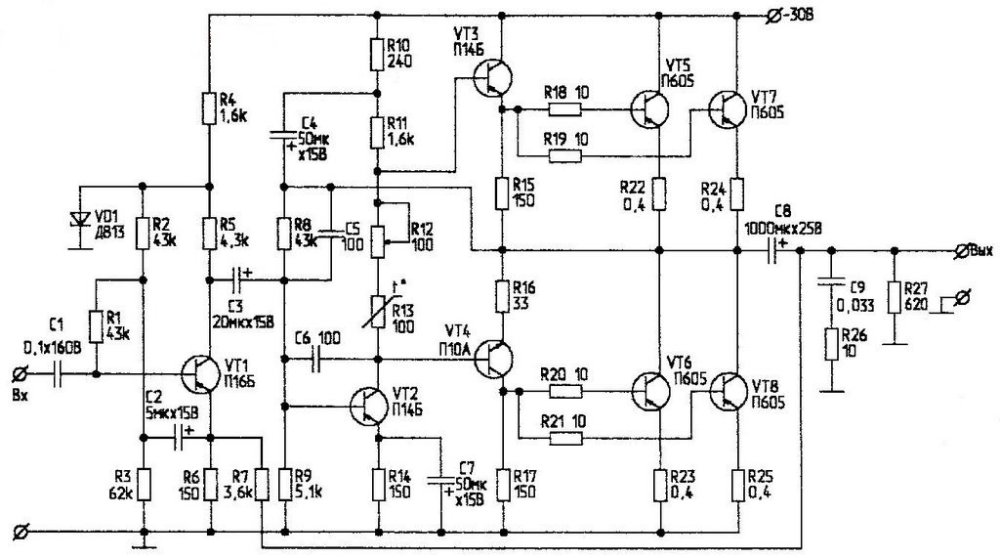 21. И не только он. Схема усилителя мощности магнитофона "Илеть 102-1" 84г.