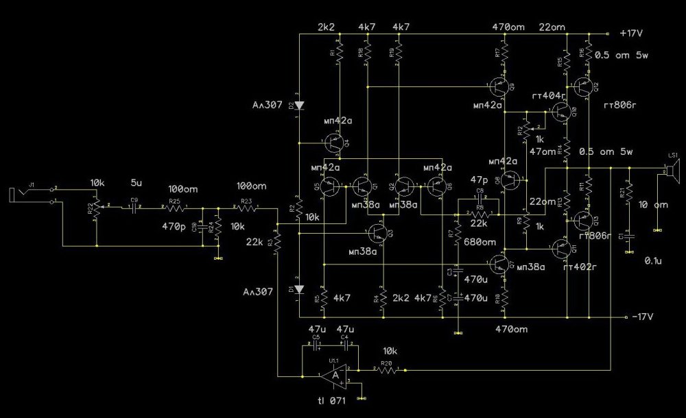 А у автора поет не свистит не чихает, у повторившего темная картинка переведенная на отечественные транзисторы тоже поет. Вот так диагностика дистанционная... https://arambajk.blogspot.com/2012/01/kvazikomplementarni-zesilovac-s.html Хватит уже вешать ярлыки на всех, нужно быть добрее.