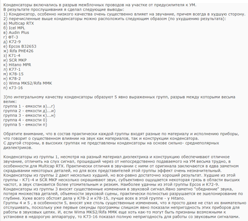 Что Рысь и выполнил включая прослушивающий конденсатор в разрыв провода между предварительным и оконечными усилителями. Всё хитро и корректно наверное на своих же блоках звучание которых он знает как младенец сосок матери. Можете сказать поведение конденсатора зависит от окружения, лампы, транзистора или громкоговорителя, кто на что горазд. Но известные слухачи не раз повторяли что характер звучания конденсатора остается, и не зависит куда его воткнуть, он остаётся и он узнаваем. Так шо...