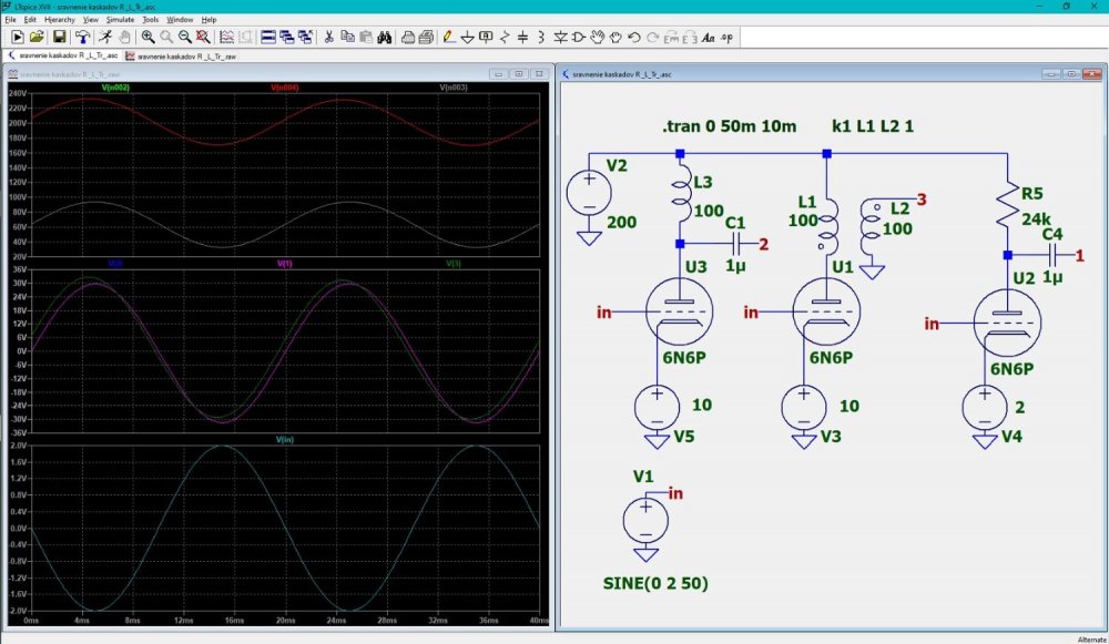 Вот на вскидку три одинаковых триода с разным вариантом нагрузки. Идеальный дроссель, идеальный трансформатор и резистор. Индуктивность с запасом, 100 генри. Питание одинаковое 200 вольт. Смещение подобрано. Видно что усиление каскадов практически одинаковое, тут выигрыша нет. Но есть фазовый сдвиг на дросселе и трансформаторе. Ниже частота-больше сдвиг. Думаю это плохо. Причем трансформатор и дроссель с разд. конд. ведут себя абсолютно одинаково. Осциллограммы слились. А вот напряжения на аноде очень разные и оптимальное смещение каскада тоже. Это значит что дроссельный(трансформаторный) каскад сможет пропустиь гораздо большую амплитуду сигнала чем резистивный каскад. А это несомненно хорошо если нам нужно "раскачать" каскад с очень "тугой" лампой. Типа ГМ70 или 211.