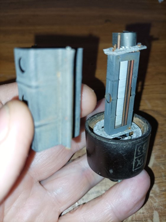 Это внутри 6П31С. Разбилась. Жалко не знамо как. Слева анод, снятый. Под ним "лучеобразущая" пластина. Классическая конструкция.