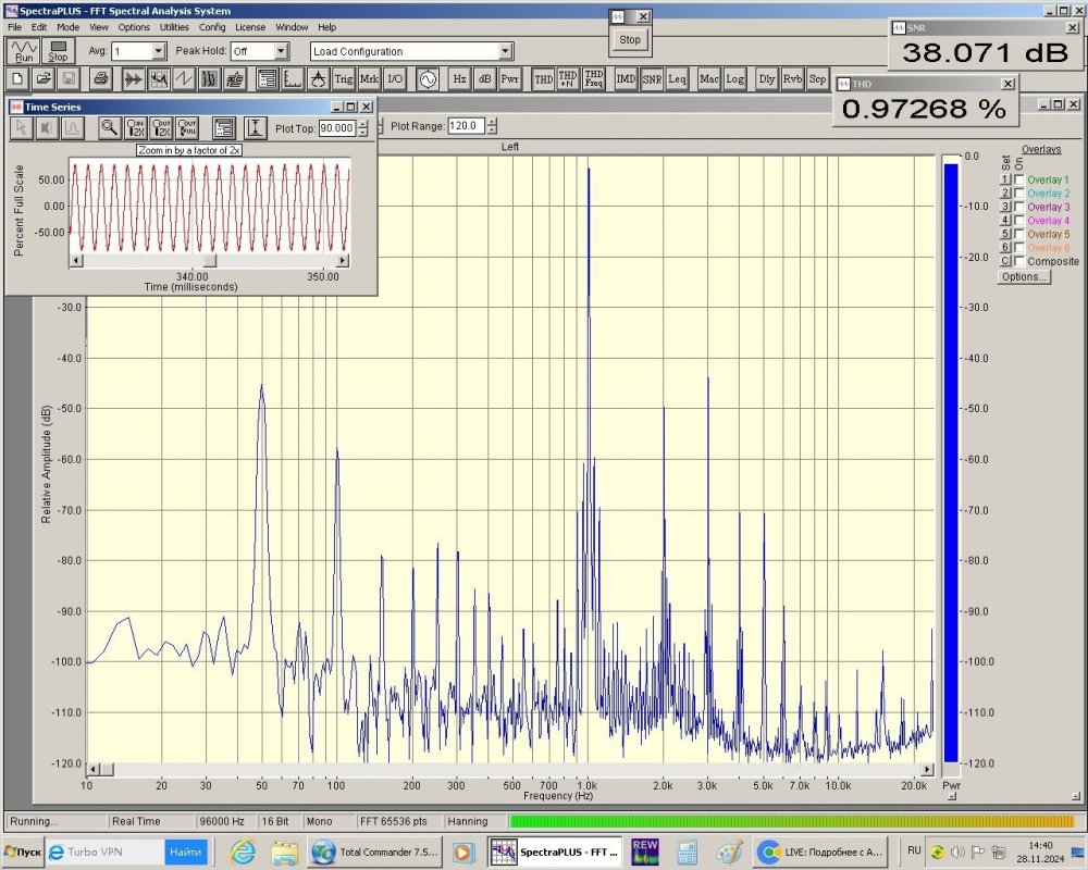 По искажениям: Это максимальная мощность. Пики на 50 и 100гц. это питание накалов выходных ламп переменным током. Так сказать по классике. Да, фон слышно, если близко у колонке подойти, но зато звук очень интересный. Постоянка такого не даёт..