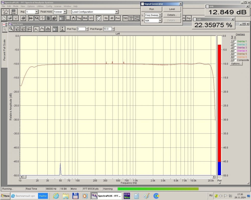 Вот дособрал УНЧ SE на 6С4С. Как видите весь на ОСМ-ах. Питание на ОСМ1-0,16 выходные на ОСМ1-0,063 Ra примерно 6 Ком, выходная мощность 3 ватта. на 8 ом. КНИ при максимальной мощности, менее 1% АЧХ на максимально мощности: Резкие обрывы сверху и снизу обусловлены ограничениями звуковой карты. Она довольно дешманская. Ну и каскад "раскачки" на 6Н9С не очень далеко простирается "вверх". Сам ТВЗ явно может доигрывать выше.