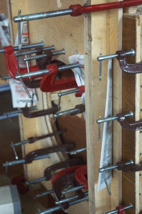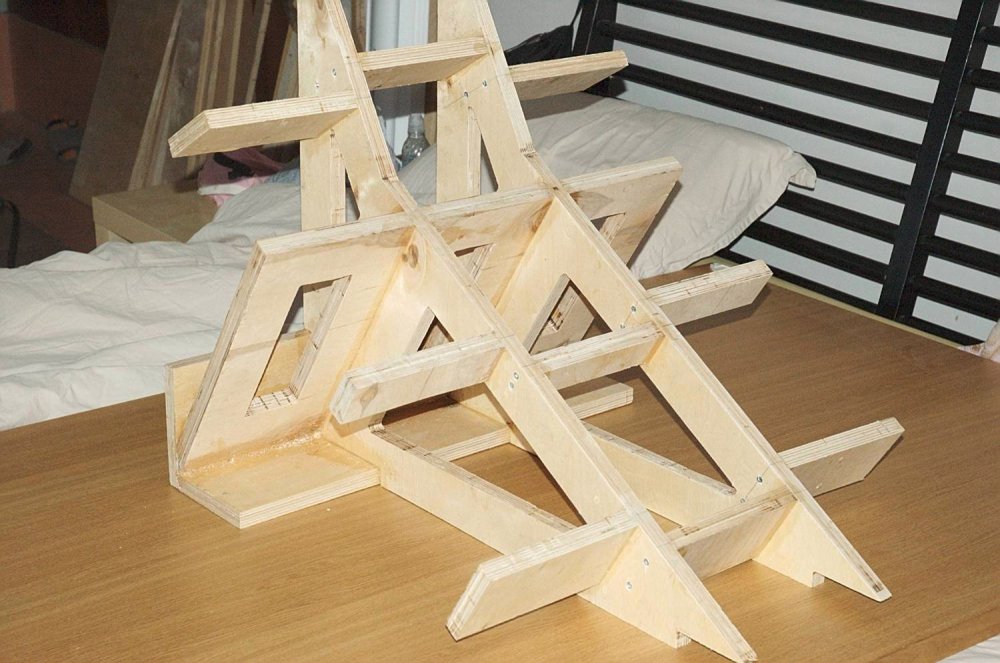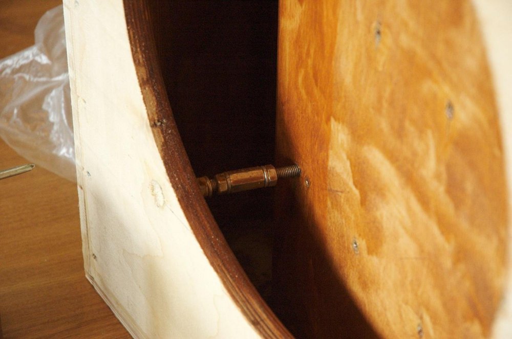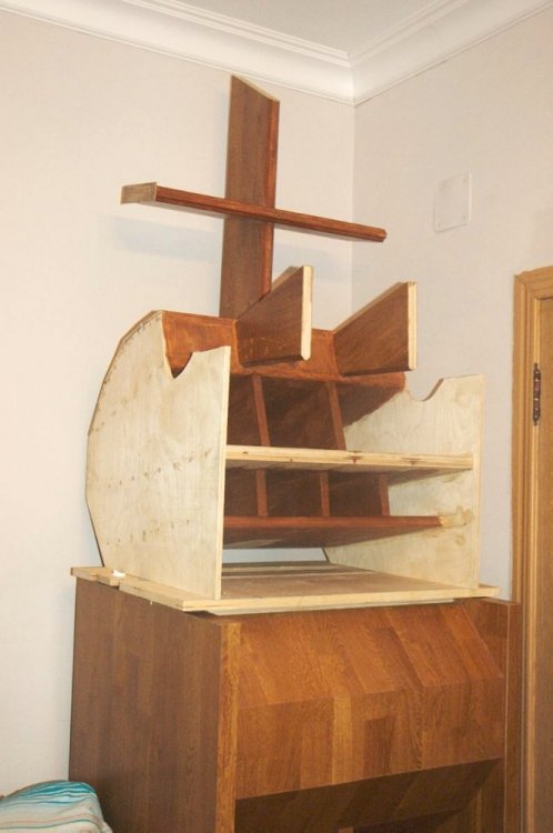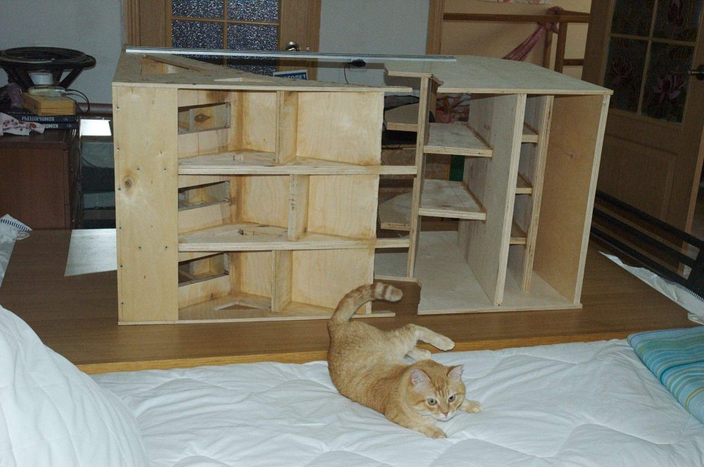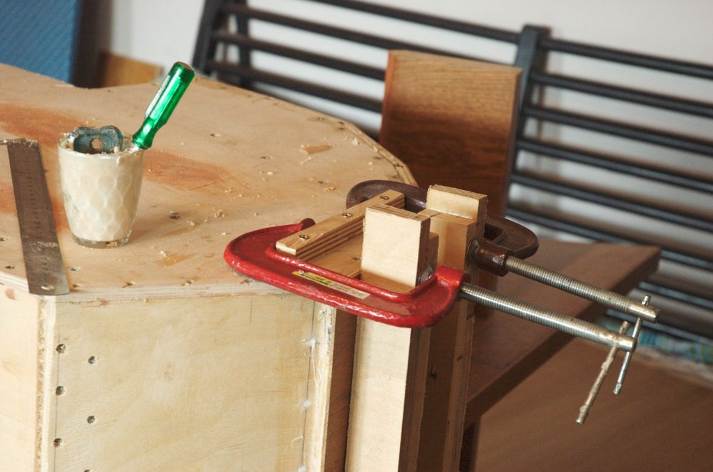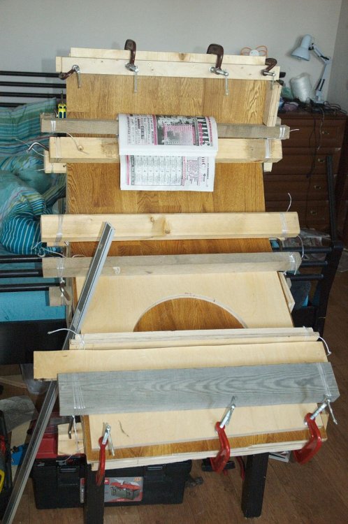 Начал со сборки вот такой "ноги", дающей нижний край устья рупора. Верхнюю часть, к сожалению, отдельно не запечатлей. Вот первая примерка, на ней кроме кота, который недосвалился со стапеля, видно рабочее место для сборки. Верх и низ до последнего делал отдельно, вот верх почти в сборе хранится на готовой колонке. Да, сделал сначала одну, потом другую, так как до конца не верил, что вообще получится.