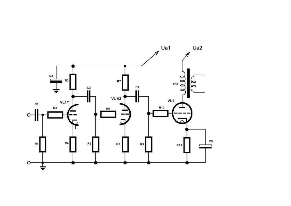 Ua1 выбрано равным 400В, на более высокое напряжение электролитические конденсаторы есть не у каждого. Ua2 = +270В, ток покоя 6С33С примерно 0,25А. Смещение, разумеется, автоматическое. R11=270, не менее 20Вт. Некоторые номиналы резисторов: R3=100k, R4=2,7k, R7=47k, R8=1,8k.