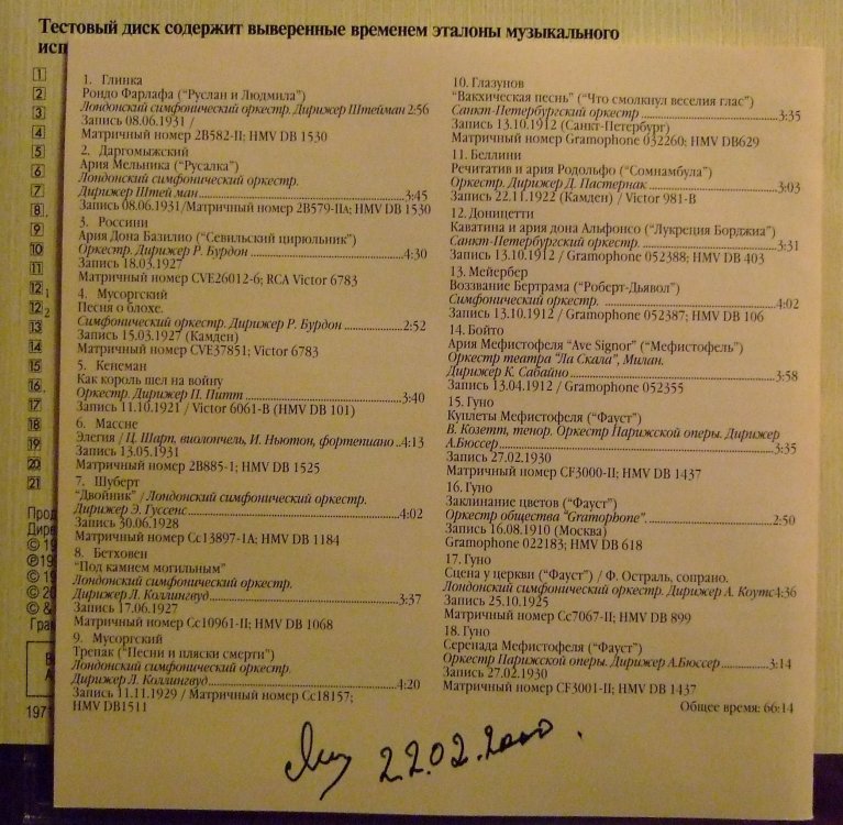 2. Странно, с ноутбука на китайские прикомповые колонки звучит интересно, как старое радио, нет серости и безжизненности, сформулируйте что есть жизнь пожалуйста, а что есть безжизненность. У меня есть диск AML Test CD + и Billie Holiday - AML+ Gold MASTER-CLONE, могу поделиться. Есть ещё такой как на картинке. Шаляпин есть пять дисков серия по годам, можно сравнить. Какие-то записи очень шумные.