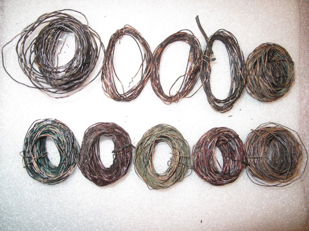 Первые четыре катушки от Harley-Davidson 1936 года. Остальные немцы, от катушки на фото. Первые четыре, все вместе - 5000 рублей. Остальные - 3000 рублей любая. Первая и третья во втором ряду - утопленники, много десятков лет пролежали в болоте. Длина немецких примерно 15 метров, диаметр вроде как 0,75 мм. Отправлю СДЭКом за Ваш счёт. Я из них делаю межблочники, акустические кабели и внутренний монтаж усилителей, но сейчас остаются излишки.