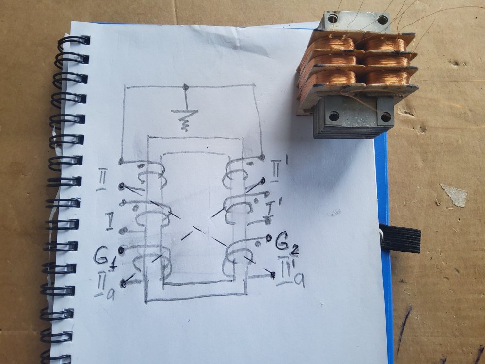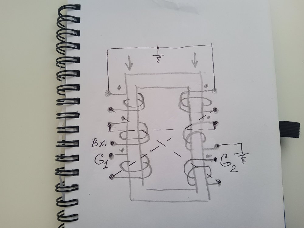 18. Намотал входные тр-ры для двухтакта, начал было коммутировать обмотки, да засомневался. Вторичку планирую последовательно-перекрестно, как на рисунке, но в этом случае между точками G1 и G2 индуктивность будет 0Гн. Так правильно? Делал подобный тр-р несколько лет назад, но тогда не удосужился померять вторичку.