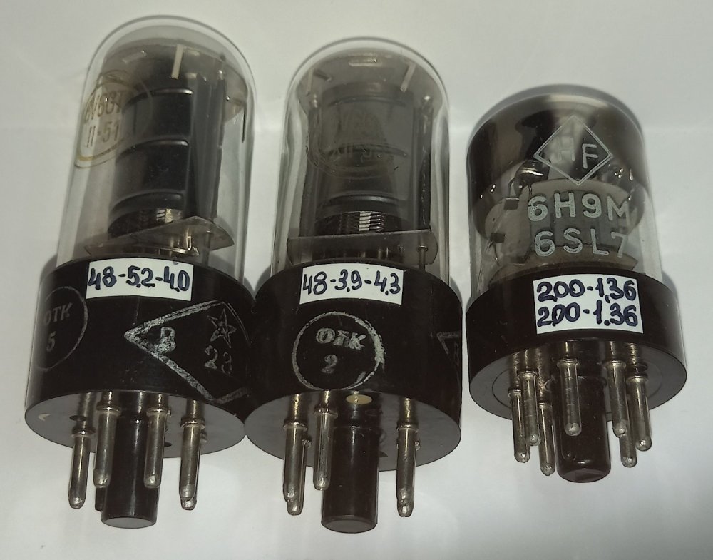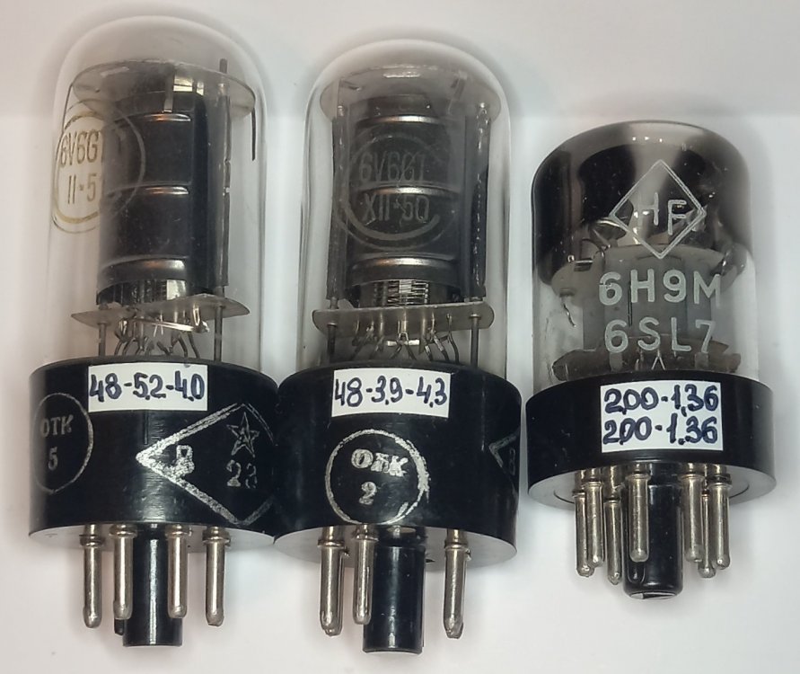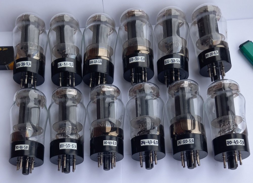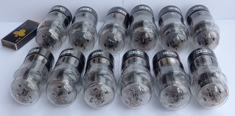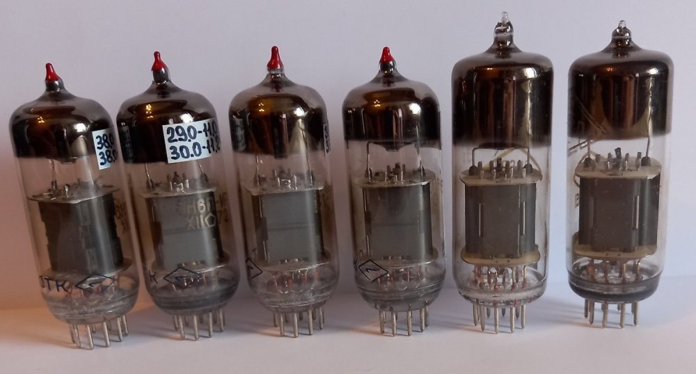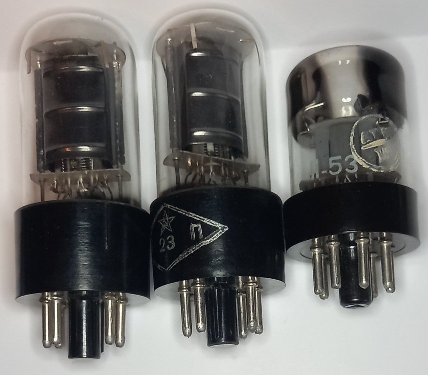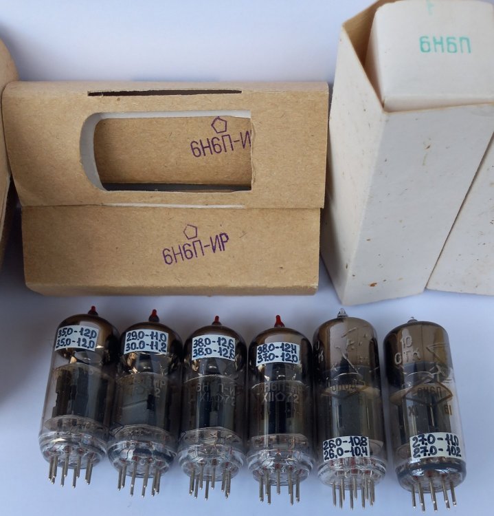 Радиолампы 6н6п 1961г.- 3 т.р.шт. Радиолампы 6н6п-ир 1972г. - 2.5 т.р.шт. ////////////////////////////////////////////////////////////////////////////////////////////// Радиолампы 6н6п , первого выпуска . с конструкцией анодной системы в виде коробки , все знают про что речь . и пояснения здесь излишне . .............................................................................................................. Радиолампы 6н6п-ир . специальная разработка , для работы в экстремальных условиях . со способностью работать при больших импульсных токах , при повышенной радиации , с большим запасом ресурсов катода . Аноды тоже в виде коробки . но в 2-2,5 раза больше по объему чем у обычных 6н6п . Вообщем все делалось для войны . Данные лампы показали просто отличные звуковые качества и свойства . в аудио трактах , усилительной техники .