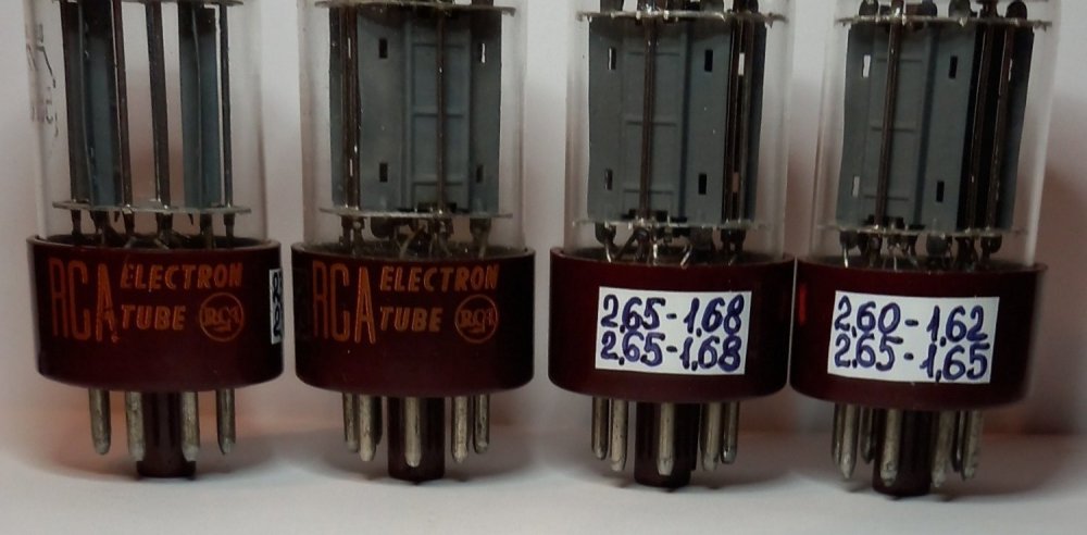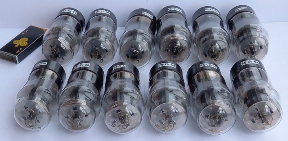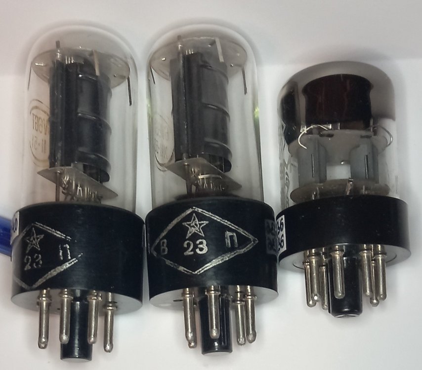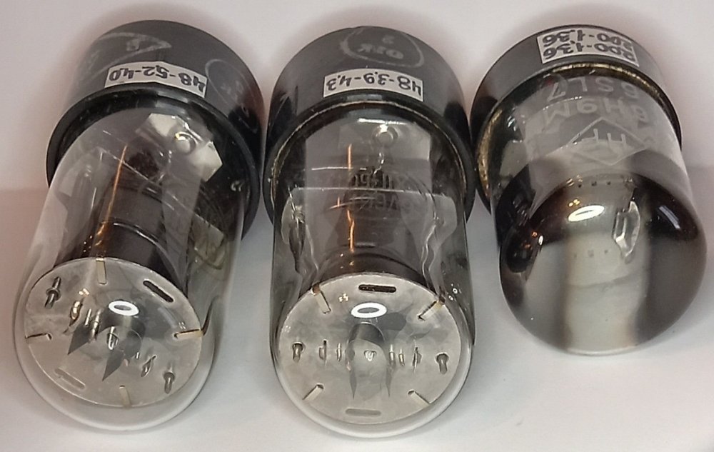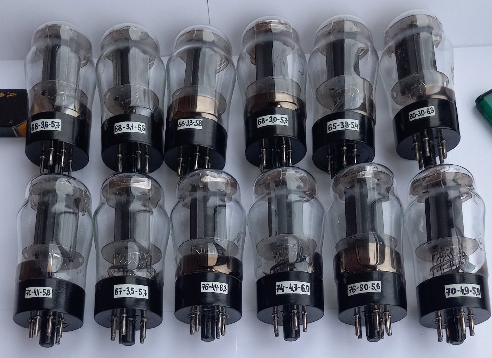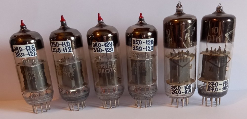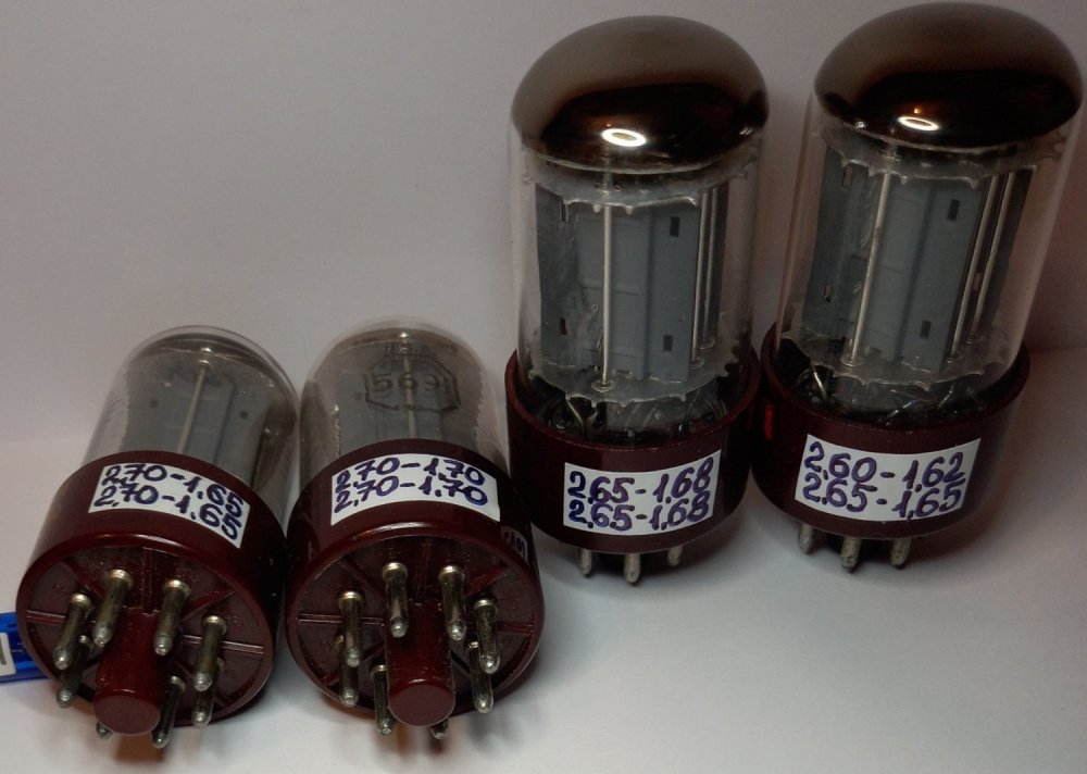 Радиолампы 6н6п 1961г.- 3 т.р.шт. Радиолампы 6н6п-ир 1972г. - 2.5 т.р.шт. ////////////////////////////////////////////////////////////////////////////////////////////// Радиолампы 6н6п , первого выпуска . с конструкцией анодной системы в виде коробки , все знают про что речь . и пояснения здесь излишне . .............................................................................................................. Радиолампы 6н6п-ир . специальная разработка , для работы в экстремальных условиях . со способностью работать при больших импульсных токах , при повышенной радиации , с большим запасом ресурсов катода . Аноды тоже в виде коробки . но в 2-2,5 раза больше по объему чем у обычных 6н6п . Вообщем все делалось для войны . Данные лампы показали просто отличные звуковые качества и свойства . в аудио трактах , усилительной техники .