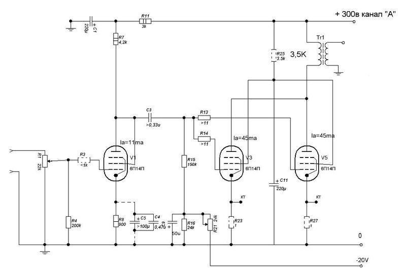 Режимы могут отличаться. Макетил в двух, когда А-К 200, сетка 150, и от одного питания в 150 В. ТВЗ были разные. Питание разное и т д. Друг делал также в двух режимах, первый УПТ связь с драйвером, кены в питании, отдельно сетку кен, в общем по феншую так сказать. Второй усь схема выше. Отличие в каких то ньансах. Оба отлично работают. Смысла наворачивать схему нет. ТВЗ 3,5 кОм более подходит для режима А-К 200-220 В, сетка 150 В. Сетка много поребляет, ей и питание мощное надо. А так, одного анодного с запасом нормуль, если за мощой не гоняться.