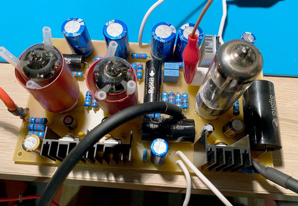 Второй канал так же переехал на новую плату. Успешно запущен в тестовом режиме и сняты замеры напряжений. Общее питание, которое приходит на вход ЭД: 350 В. После ЭД: 312 В; после первого резистора в питании 295 В; после второго резистора в питании 285 В; после третьего резистора в питании 280 В. На аноде 6П1П: 190 В; на аноде 6Н1П: 171 В; на втором аноде 6Н1П: 165 В; на аноде 6Ж32П: 137 В. На катоде 6П1П: 14,78 В; на катоде 6Н1П 3,45 В; на втором катоде 6Н1П: 3,34 В; на катоде 6Ж32П: 2,12 В. В накале стабы на 6 В стоят. Общее потребление по анодному питания 22 мА. Теперь можно устанавливать второй канал в корпус, прокладывать часть проводов и включать корректор от внешнего блока питания, чтобы исключить наводки.