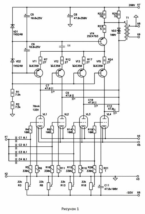 Типа что-то по типу SRPP. Ток увеличили, из-за этого снизили Ктр трансформатора, соответственно поднялась мощность. Из усилителя SE, сделали PP. Вот и поднялась мощность. А есть там 20 ватт или нет, эт надо мерить Кто хочет это повторить, так это у Евгения Карпова есть. Хотя он пишет что это однотактный каскад. Ему виднее. Ссылка